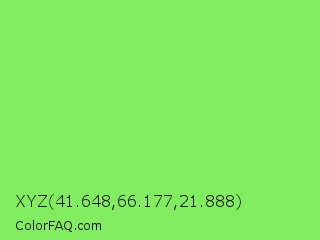 XYZ 41.648,66.177,21.888 Color is a light green color and the nearest color is Pastel Green #77dd77. Hex code #82ed61 and RGB value is rgb(130,237,97). In RGB color space, this color is composed of 51% red, 93% green, 38% blue, In CMYK color space, this color is composed of 45% cyan, 0% magenta, 59% yellow , 7% black , In HSL color space, this color has a hue angle of 106° , 80% saturation and 65% lightness.