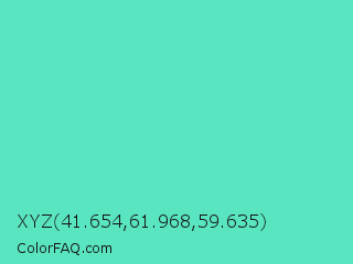 XYZ 41.654,61.968,59.635 Color is a light cyan color and the nearest color is Medium Aquamarine #66ddaa. Hex code #59e5c0 and RGB value is rgb(89,229,192). In RGB color space, this color is composed of 35% red, 90% green, 75% blue, In CMYK color space, this color is composed of 61% cyan, 0% magenta, 16% yellow , 10% black , In HSL color space, this color has a hue angle of 164° , 73% saturation and 62% lightness.