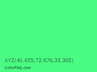 XYZ 41.655,72.676,33.305 Color is a light green color and the nearest color is Very Light Malachite Green #64e986. Hex code #49fc83 and RGB value is rgb(73,252,131). In RGB color space, this color is composed of 29% red, 99% green, 51% blue, In CMYK color space, this color is composed of 71% cyan, 0% magenta, 48% yellow , 1% black , In HSL color space, this color has a hue angle of 139° , 97% saturation and 64% lightness.