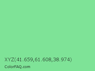 XYZ 41.659,61.608,38.974 Color is a light green color and the nearest color is Light Green #90ee90. Hex code #7ee397 and RGB value is rgb(126,227,151). In RGB color space, this color is composed of 49% red, 89% green, 59% blue, In CMYK color space, this color is composed of 44% cyan, 0% magenta, 33% yellow , 11% black , In HSL color space, this color has a hue angle of 135° , 64% saturation and 69% lightness.