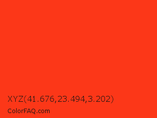 XYZ 41.676,23.494,3.202 Color is a normal red color and the nearest color is Red RYB #fe2712. Hex code #fc3718 and RGB value is rgb(252,55,24). In RGB color space, this color is composed of 99% red, 22% green, 9% blue, In CMYK color space, this color is composed of 0% cyan, 78% magenta, 90% yellow , 1% black , In HSL color space, this color has a hue angle of 8° , 97% saturation and 54% lightness.