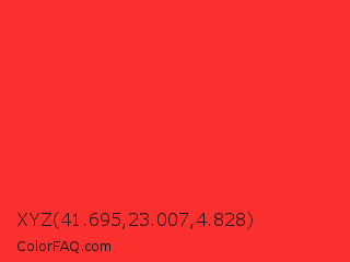 XYZ 41.695,23.007,4.828 Color is a normal red color and the nearest color is Deep Carmine Pink #ef3038. Hex code #fc302e and RGB value is rgb(252,48,46). In RGB color space, this color is composed of 99% red, 19% green, 18% blue, In CMYK color space, this color is composed of 0% cyan, 81% magenta, 82% yellow , 1% black , In HSL color space, this color has a hue angle of 1° , 97% saturation and 58% lightness.