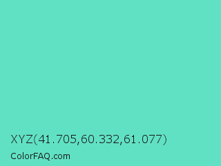 XYZ 41.705,60.332,61.077 Color is a light cyan color and the nearest color is Downy #6fd0c5. Hex code #61e1c3 and RGB value is rgb(97,225,195). In RGB color space, this color is composed of 38% red, 88% green, 76% blue, In CMYK color space, this color is composed of 57% cyan, 0% magenta, 13% yellow , 12% black , In HSL color space, this color has a hue angle of 166° , 68% saturation and 63% lightness.
