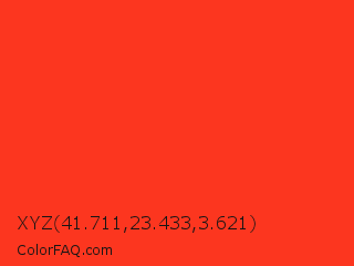 XYZ 41.711,23.433,3.621 Color is a normal red color and the nearest color is Pomegranate #f34723. Hex code #fc361f and RGB value is rgb(252,54,31). In RGB color space, this color is composed of 99% red, 21% green, 12% blue, In CMYK color space, this color is composed of 0% cyan, 79% magenta, 88% yellow , 1% black , In HSL color space, this color has a hue angle of 6° , 97% saturation and 55% lightness.