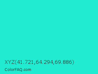 XYZ 41.721,64.294,69.886 Color is a normal cyan color and the nearest color is Turquoise PWG #30d5c8. Hex code #21ebd0 and RGB value is rgb(33,235,208). In RGB color space, this color is composed of 13% red, 92% green, 82% blue, In CMYK color space, this color is composed of 86% cyan, 0% magenta, 11% yellow , 8% black , In HSL color space, this color has a hue angle of 172° , 83% saturation and 53% lightness.