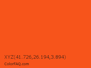 XYZ 41.726,26.194,3.894 Color is a normal orange color and the nearest color is Giants Orange #fe5a1d. Hex code #f7541b and RGB value is rgb(247,84,27). In RGB color space, this color is composed of 97% red, 33% green, 11% blue, In CMYK color space, this color is composed of 0% cyan, 66% magenta, 89% yellow , 3% black , In HSL color space, this color has a hue angle of 16° , 93% saturation and 54% lightness.