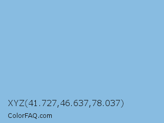 XYZ 41.727,46.637,78.037 Color is a light blue color and the nearest color is Dark Sky Blue #8cbed6. Hex code #88bce1 and RGB value is rgb(136,188,225). In RGB color space, this color is composed of 53% red, 74% green, 88% blue, In CMYK color space, this color is composed of 40% cyan, 16% magenta, 0% yellow , 12% black , In HSL color space, this color has a hue angle of 205° , 60% saturation and 71% lightness.