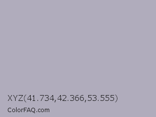 XYZ 41.734,42.366,53.555 Color is a light indigo color and the nearest color is Bombay #afb1b8. Hex code #b0acbc and RGB value is rgb(176,172,188). In RGB color space, this color is composed of 69% red, 67% green, 74% blue, In CMYK color space, this color is composed of 6% cyan, 9% magenta, 0% yellow , 26% black , In HSL color space, this color has a hue angle of 255° , 11% saturation and 71% lightness.