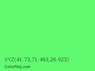 XYZ 41.73,71.463,26.923 Color is a light green color and the nearest color is Screamin Green #66ff66. Hex code #61f970 and RGB value is rgb(97,249,112). In RGB color space, this color is composed of 38% red, 98% green, 44% blue, In CMYK color space, this color is composed of 61% cyan, 0% magenta, 55% yellow , 2% black , In HSL color space, this color has a hue angle of 126° , 93% saturation and 68% lightness.