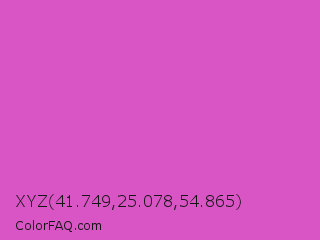 XYZ 41.749,25.078,54.865 Color is a normal magenta color and the nearest color is Fuchsia Pink #c154c1. Hex code #d954c4 and RGB value is rgb(217,84,196). In RGB color space, this color is composed of 85% red, 33% green, 77% blue, In CMYK color space, this color is composed of 0% cyan, 61% magenta, 10% yellow , 15% black , In HSL color space, this color has a hue angle of 309° , 64% saturation and 59% lightness.