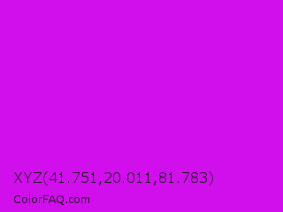 XYZ 41.751,20.011,81.783 Color is a normal magenta color and the nearest color is Vivid Orchid #cc00ff. Hex code #d10fed and RGB value is rgb(209,15,237). In RGB color space, this color is composed of 82% red, 6% green, 93% blue, In CMYK color space, this color is composed of 12% cyan, 94% magenta, 0% yellow , 7% black , In HSL color space, this color has a hue angle of 292° , 88% saturation and 49% lightness.