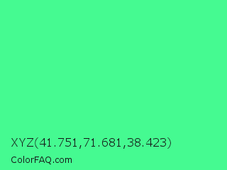 XYZ 41.751,71.681,38.423 Color is a light green color and the nearest color is Very Light Malachite Green #64e986. Hex code #45fa91 and RGB value is rgb(69,250,145). In RGB color space, this color is composed of 27% red, 98% green, 57% blue, In CMYK color space, this color is composed of 72% cyan, 0% magenta, 42% yellow , 2% black , In HSL color space, this color has a hue angle of 145° , 95% saturation and 63% lightness.