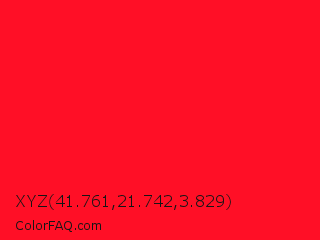 XYZ 41.761,21.742,3.829 Color is a normal red color and the nearest color is Vivid Red #f70d1a. Hex code #ff0f26 and RGB value is rgb(255,15,38). In RGB color space, this color is composed of 100% red, 6% green, 15% blue, In CMYK color space, this color is composed of 0% cyan, 94% magenta, 85% yellow , 0% black , In HSL color space, this color has a hue angle of 354° , 100% saturation and 53% lightness.