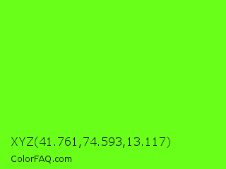 XYZ 41.761,74.593,13.117 Color is a normal green color and the nearest color is Bright Green #66ff00. Hex code #69ff19 and RGB value is rgb(105,255,25). In RGB color space, this color is composed of 41% red, 100% green, 10% blue, In CMYK color space, this color is composed of 59% cyan, 0% magenta, 90% yellow , 0% black , In HSL color space, this color has a hue angle of 99° , 100% saturation and 55% lightness.