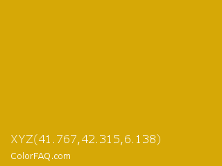 XYZ 41.767,42.315,6.138 Color is a normal yellow color and the nearest color is Galliano #dcb20c. Hex code #d6a806 and RGB value is rgb(214,168,6). In RGB color space, this color is composed of 84% red, 66% green, 2% blue, In CMYK color space, this color is composed of 0% cyan, 21% magenta, 97% yellow , 16% black , In HSL color space, this color has a hue angle of 47° , 95% saturation and 43% lightness.