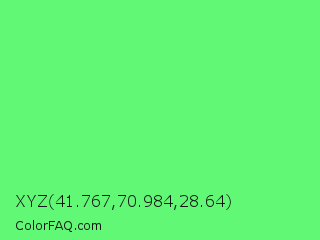 XYZ 41.767,70.984,28.64 Color is a light green color and the nearest color is Screamin Green #66ff66. Hex code #61f876 and RGB value is rgb(97,248,118). In RGB color space, this color is composed of 38% red, 97% green, 46% blue, In CMYK color space, this color is composed of 61% cyan, 0% magenta, 52% yellow , 3% black , In HSL color space, this color has a hue angle of 128° , 92% saturation and 68% lightness.