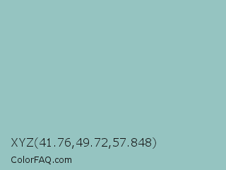 XYZ 41.76,49.72,57.848 Color is a light cyan color and the nearest color is Shadow Green #9ac2b8. Hex code #95c4c1 and RGB value is rgb(149,196,193). In RGB color space, this color is composed of 58% red, 77% green, 76% blue, In CMYK color space, this color is composed of 24% cyan, 0% magenta, 2% yellow , 23% black , In HSL color space, this color has a hue angle of 176° , 28% saturation and 68% lightness.
