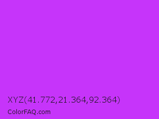XYZ 41.772,21.364,92.364 Color is a normal purple color and the nearest color is Veronica #a020f0. Hex code #c634fa and RGB value is rgb(198,52,250). In RGB color space, this color is composed of 78% red, 20% green, 98% blue, In CMYK color space, this color is composed of 21% cyan, 79% magenta, 0% yellow , 2% black , In HSL color space, this color has a hue angle of 284° , 95% saturation and 59% lightness.