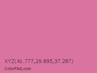 XYZ 41.777,29.895,37.287 Color is a light rose color and the nearest color is Thulian Pink #de6fa1. Hex code #db73a1 and RGB value is rgb(219,115,161). In RGB color space, this color is composed of 86% red, 45% green, 63% blue, In CMYK color space, this color is composed of 0% cyan, 47% magenta, 26% yellow , 14% black , In HSL color space, this color has a hue angle of 333° , 59% saturation and 65% lightness.