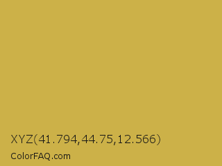 XYZ 41.794,44.75,12.566 Color is a normal yellow color and the nearest color is Turmeric #cabb48. Hex code #ccb148 and RGB value is rgb(204,177,72). In RGB color space, this color is composed of 80% red, 69% green, 28% blue, In CMYK color space, this color is composed of 0% cyan, 13% magenta, 65% yellow , 20% black , In HSL color space, this color has a hue angle of 48° , 56% saturation and 54% lightness.