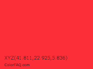 XYZ 41.811,22.925,5.836 Color is a normal red color and the nearest color is Deep Carmine Pink #ef3038. Hex code #fc2e37 and RGB value is rgb(252,46,55). In RGB color space, this color is composed of 99% red, 18% green, 22% blue, In CMYK color space, this color is composed of 0% cyan, 82% magenta, 78% yellow , 1% black , In HSL color space, this color has a hue angle of 357° , 97% saturation and 58% lightness.