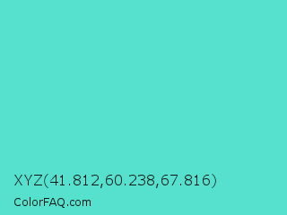 XYZ 41.812,60.238,67.816 Color is a light cyan color and the nearest color is Medium Turquoise #48d1cc. Hex code #55e1ce and RGB value is rgb(85,225,206). In RGB color space, this color is composed of 33% red, 88% green, 81% blue, In CMYK color space, this color is composed of 62% cyan, 0% magenta, 8% yellow , 12% black , In HSL color space, this color has a hue angle of 172° , 70% saturation and 61% lightness.