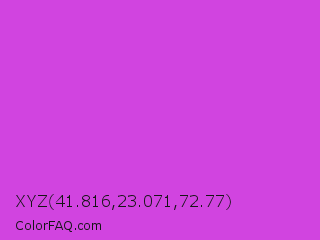 XYZ 41.816,23.071,72.77 Color is a normal magenta color and the nearest color is Steel Pink #cc33cc. Hex code #d144e0 and RGB value is rgb(209,68,224). In RGB color space, this color is composed of 82% red, 27% green, 88% blue, In CMYK color space, this color is composed of 7% cyan, 70% magenta, 0% yellow , 12% black , In HSL color space, this color has a hue angle of 294° , 72% saturation and 57% lightness.
