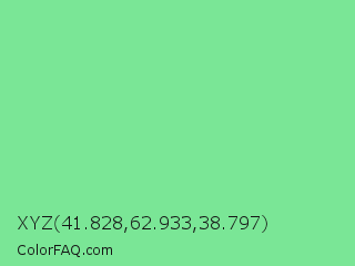 XYZ 41.828,62.933,38.797 Color is a light green color and the nearest color is Light Green #90ee90. Hex code #7ae696 and RGB value is rgb(122,230,150). In RGB color space, this color is composed of 48% red, 90% green, 59% blue, In CMYK color space, this color is composed of 47% cyan, 0% magenta, 35% yellow , 10% black , In HSL color space, this color has a hue angle of 136° , 68% saturation and 69% lightness.