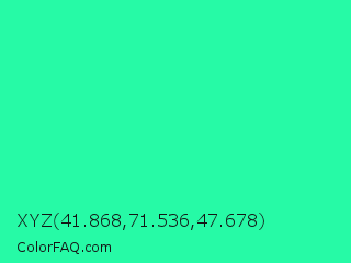 XYZ 41.868,71.536,47.678 Color is a normal green color and the nearest color is Medium Spring Green #00fa9a. Hex code #26faa6 and RGB value is rgb(38,250,166). In RGB color space, this color is composed of 15% red, 98% green, 65% blue, In CMYK color space, this color is composed of 85% cyan, 0% magenta, 34% yellow , 2% black , In HSL color space, this color has a hue angle of 156° , 95% saturation and 56% lightness.