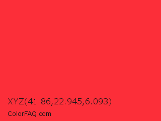 XYZ 41.86,22.945,6.093 Color is a normal red color and the nearest color is Deep Carmine Pink #ef3038. Hex code #fc2e39 and RGB value is rgb(252,46,57). In RGB color space, this color is composed of 99% red, 18% green, 22% blue, In CMYK color space, this color is composed of 0% cyan, 82% magenta, 77% yellow , 1% black , In HSL color space, this color has a hue angle of 357° , 97% saturation and 58% lightness.