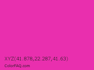 XYZ 41.878,22.287,41.63 Color is a normal magenta color and the nearest color is Frostbite #e936a7. Hex code #e830ad and RGB value is rgb(232,48,173). In RGB color space, this color is composed of 91% red, 19% green, 68% blue, In CMYK color space, this color is composed of 0% cyan, 79% magenta, 25% yellow , 9% black , In HSL color space, this color has a hue angle of 319° , 80% saturation and 55% lightness.