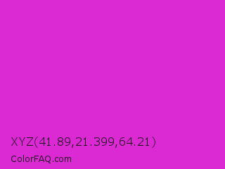 XYZ 41.89,21.399,64.21 Color is a normal magenta color and the nearest color is Steel Pink #cc33cc. Hex code #db29d4 and RGB value is rgb(219,41,212). In RGB color space, this color is composed of 86% red, 16% green, 83% blue, In CMYK color space, this color is composed of 0% cyan, 81% magenta, 3% yellow , 14% black , In HSL color space, this color has a hue angle of 302° , 71% saturation and 51% lightness.