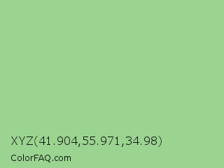 XYZ 41.904,55.971,34.98 Color is a light green color and the nearest color is Feijoa #9fdd8c. Hex code #9ad490 and RGB value is rgb(154,212,144). In RGB color space, this color is composed of 60% red, 83% green, 56% blue, In CMYK color space, this color is composed of 27% cyan, 0% magenta, 32% yellow , 17% black , In HSL color space, this color has a hue angle of 111° , 44% saturation and 70% lightness.