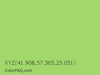 XYZ 41.908,57.365,23.051 Color is a light green color and the nearest color is Pistachio #93c572. Hex code #a2d76c and RGB value is rgb(162,215,108). In RGB color space, this color is composed of 64% red, 84% green, 42% blue, In CMYK color space, this color is composed of 25% cyan, 0% magenta, 50% yellow , 16% black , In HSL color space, this color has a hue angle of 90° , 57% saturation and 63% lightness.