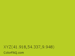 XYZ 41.918,54.337,9.948 Color is a normal yellow color and the nearest color is Key Lime Pie #bfc921. Hex code #b7ce24 and RGB value is rgb(183,206,36). In RGB color space, this color is composed of 72% red, 81% green, 14% blue, In CMYK color space, this color is composed of 11% cyan, 0% magenta, 83% yellow , 19% black , In HSL color space, this color has a hue angle of 68° , 70% saturation and 47% lightness.