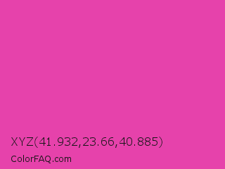 XYZ 41.932,23.66,40.885 Color is a normal magenta color and the nearest color is Frostbite #e936a7. Hex code #e642ab and RGB value is rgb(230,66,171). In RGB color space, this color is composed of 90% red, 26% green, 67% blue, In CMYK color space, this color is composed of 0% cyan, 71% magenta, 26% yellow , 10% black , In HSL color space, this color has a hue angle of 322° , 77% saturation and 58% lightness.