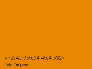 XYZ 41.959,34.49,4.532 Color is a normal orange color and the nearest color is Fulvous #e48400. Hex code #e88703 and RGB value is rgb(232,135,3). In RGB color space, this color is composed of 91% red, 53% green, 1% blue, In CMYK color space, this color is composed of 0% cyan, 42% magenta, 99% yellow , 9% black , In HSL color space, this color has a hue angle of 35° , 97% saturation and 46% lightness.