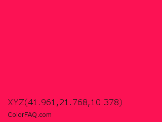 XYZ 41.961,21.768,10.378 Color is a normal rose color and the nearest color is Awesome #ff2052. Hex code #fc1254 and RGB value is rgb(252,18,84). In RGB color space, this color is composed of 99% red, 7% green, 33% blue, In CMYK color space, this color is composed of 0% cyan, 93% magenta, 67% yellow , 1% black , In HSL color space, this color has a hue angle of 343° , 98% saturation and 53% lightness.
