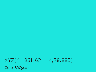 XYZ 41.961,62.114,78.885 Color is a normal cyan color and the nearest color is Bright Turquoise #08e8de. Hex code #1ce6de and RGB value is rgb(28,230,222). In RGB color space, this color is composed of 11% red, 90% green, 87% blue, In CMYK color space, this color is composed of 88% cyan, 0% magenta, 3% yellow , 10% black , In HSL color space, this color has a hue angle of 178° , 80% saturation and 51% lightness.