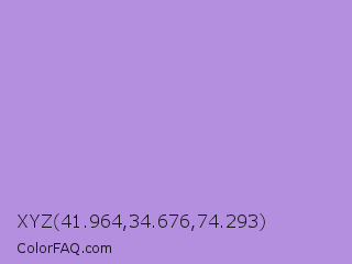 XYZ 41.964,34.676,74.293 Color is a light violet color and the nearest color is Bright Lavender #bf94e4. Hex code #b48fdf and RGB value is rgb(180,143,223). In RGB color space, this color is composed of 71% red, 56% green, 87% blue, In CMYK color space, this color is composed of 19% cyan, 36% magenta, 0% yellow , 13% black , In HSL color space, this color has a hue angle of 268° , 56% saturation and 72% lightness.