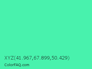XYZ 41.967,67.899,50.429 Color is a light green color and the nearest color is Eucalyptus #44d7a8. Hex code #48f2ad and RGB value is rgb(72,242,173). In RGB color space, this color is composed of 28% red, 95% green, 68% blue, In CMYK color space, this color is composed of 70% cyan, 0% magenta, 29% yellow , 5% black , In HSL color space, this color has a hue angle of 156° , 87% saturation and 62% lightness.