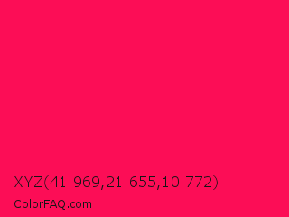 XYZ 41.969,21.655,10.772 Color is a normal rose color and the nearest color is Folly #ff004f. Hex code #fc0d56 and RGB value is rgb(252,13,86). In RGB color space, this color is composed of 99% red, 5% green, 34% blue, In CMYK color space, this color is composed of 0% cyan, 95% magenta, 66% yellow , 1% black , In HSL color space, this color has a hue angle of 342° , 98% saturation and 52% lightness.