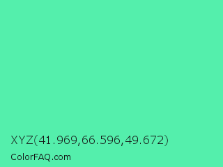 XYZ 41.969,66.596,49.672 Color is a light green color and the nearest color is Medium Aquamarine #66ddaa. Hex code #54efac and RGB value is rgb(84,239,172). In RGB color space, this color is composed of 33% red, 94% green, 67% blue, In CMYK color space, this color is composed of 65% cyan, 0% magenta, 28% yellow , 6% black , In HSL color space, this color has a hue angle of 154° , 83% saturation and 63% lightness.