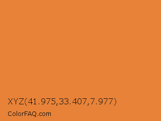 XYZ 41.975,33.407,7.977 Color is a normal orange color and the nearest color is Jaffa #ef863f. Hex code #e88238 and RGB value is rgb(232,130,56). In RGB color space, this color is composed of 91% red, 51% green, 22% blue, In CMYK color space, this color is composed of 0% cyan, 44% magenta, 76% yellow , 9% black , In HSL color space, this color has a hue angle of 25° , 79% saturation and 56% lightness.