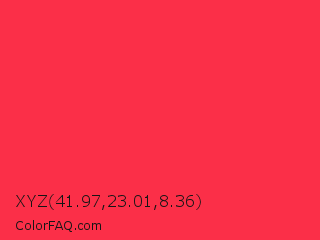 XYZ 41.97,23.01,8.36 Color is a normal red color and the nearest color is Red Salsa #fd3a4a. Hex code #fb2f48 and RGB value is rgb(251,47,72). In RGB color space, this color is composed of 98% red, 18% green, 28% blue, In CMYK color space, this color is composed of 0% cyan, 81% magenta, 71% yellow , 2% black , In HSL color space, this color has a hue angle of 353° , 96% saturation and 58% lightness.