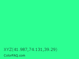 XYZ 41.987,74.131,39.29 Color is a normal green color and the nearest color is Medium Spring Green #00fa9a. Hex code #2cff92 and RGB value is rgb(44,255,146). In RGB color space, this color is composed of 17% red, 100% green, 57% blue, In CMYK color space, this color is composed of 83% cyan, 0% magenta, 43% yellow , 0% black , In HSL color space, this color has a hue angle of 149° , 100% saturation and 59% lightness.