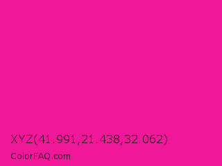 XYZ 41.991,21.438,32.062 Color is a normal magenta color and the nearest color is Fluorescent Pink #ff1493. Hex code #f01799 and RGB value is rgb(240,23,153). In RGB color space, this color is composed of 94% red, 9% green, 60% blue, In CMYK color space, this color is composed of 0% cyan, 90% magenta, 36% yellow , 6% black , In HSL color space, this color has a hue angle of 324° , 88% saturation and 52% lightness.