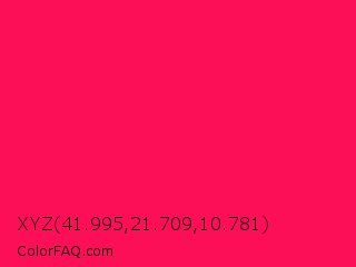 XYZ 41.995,21.709,10.781 Color is a normal rose color and the nearest color is Folly #ff004f. Hex code #fc0f56 and RGB value is rgb(252,15,86). In RGB color space, this color is composed of 99% red, 6% green, 34% blue, In CMYK color space, this color is composed of 0% cyan, 94% magenta, 66% yellow , 1% black , In HSL color space, this color has a hue angle of 342° , 98% saturation and 52% lightness.