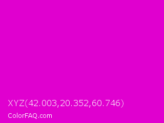 XYZ 42.003,20.352,60.746 Color is a normal magenta color and the nearest color is Deep Magenta #cc00cc. Hex code #e000cf and RGB value is rgb(224,0,207). In RGB color space, this color is composed of 88% red, 0% green, 81% blue, In CMYK color space, this color is composed of 0% cyan, 100% magenta, 8% yellow , 12% black , In HSL color space, this color has a hue angle of 305° , 100% saturation and 44% lightness.