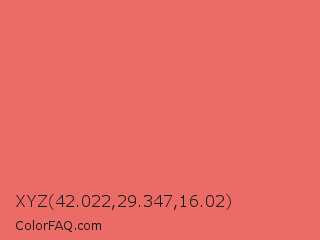XYZ 42.022,29.347,16.02 Color is a light red color and the nearest color is Sunglo #e16865. Hex code #eb6c66 and RGB value is rgb(235,108,102). In RGB color space, this color is composed of 92% red, 42% green, 40% blue, In CMYK color space, this color is composed of 0% cyan, 54% magenta, 57% yellow , 8% black , In HSL color space, this color has a hue angle of 3° , 77% saturation and 66% lightness.